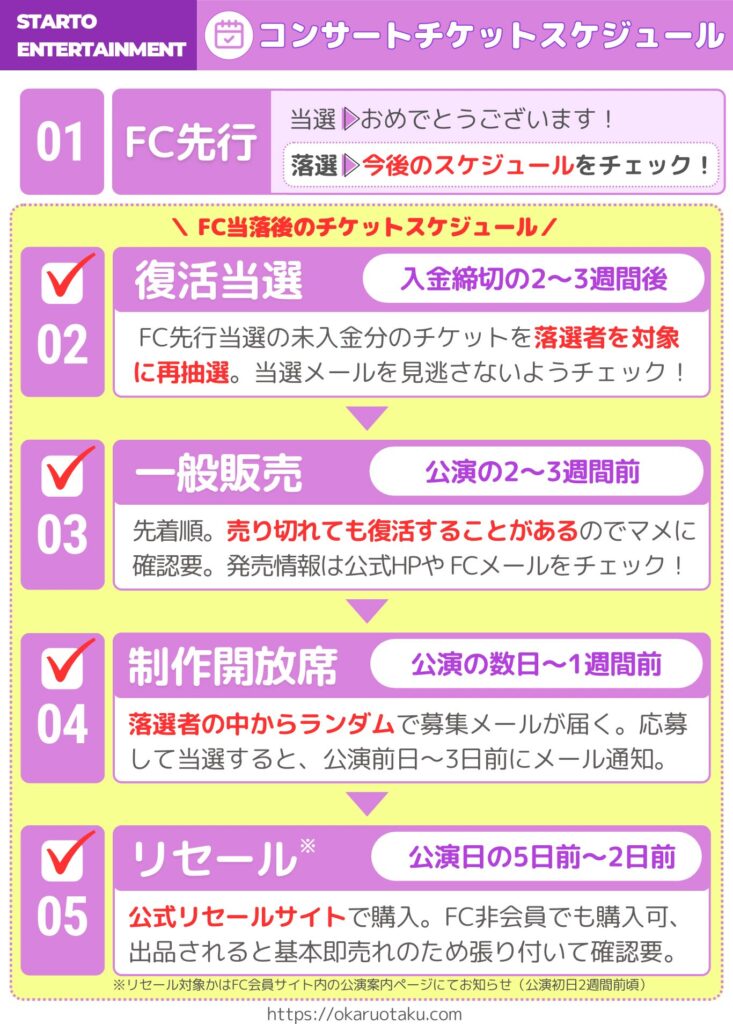 一般的なSTARTO社のチケット販売のスケジュールは以下の通りです。