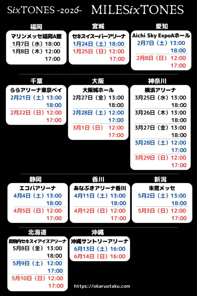 SixTONESのアリーナツアー2026では11都市50公演、動員は最大61.8万人になります。なお、ステージ構成によって収容人数は変動するので参考値となります。