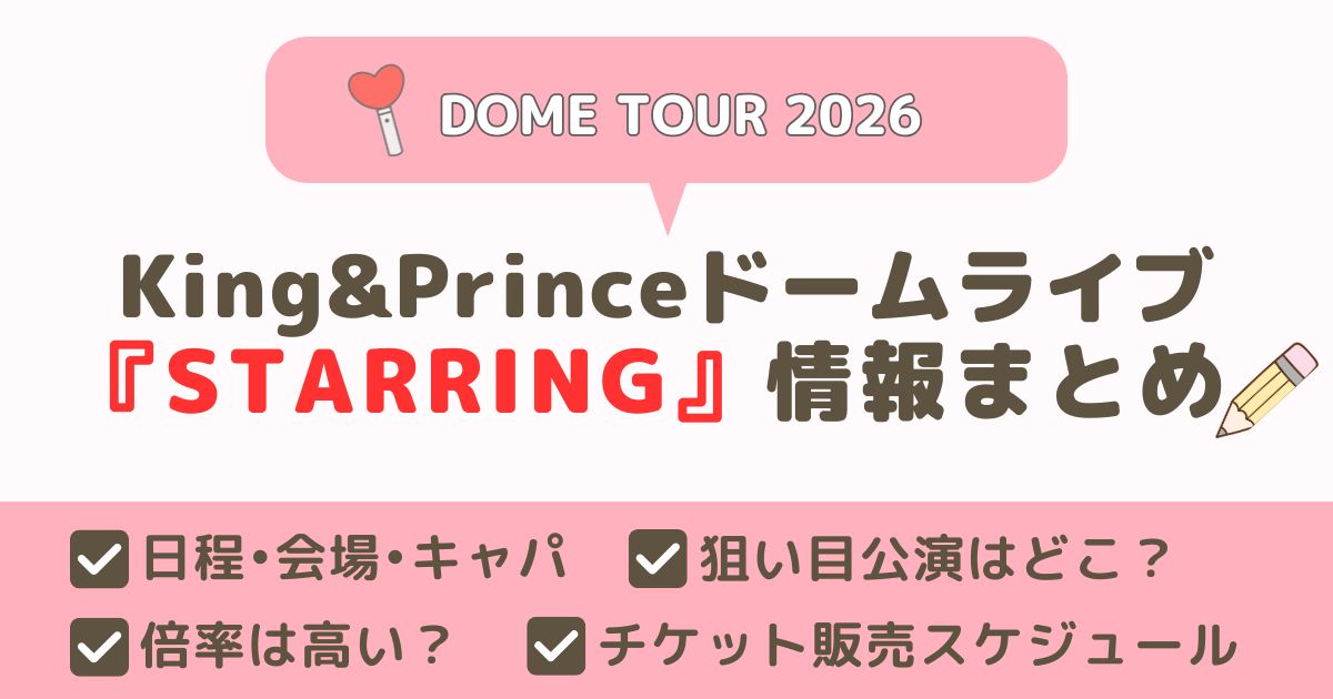 King&Princeのドームツアーでは4都市8公演、動員は最大約42,6万人になります。なお、ステージ構成によって収容人数は変動するので参考値となります。