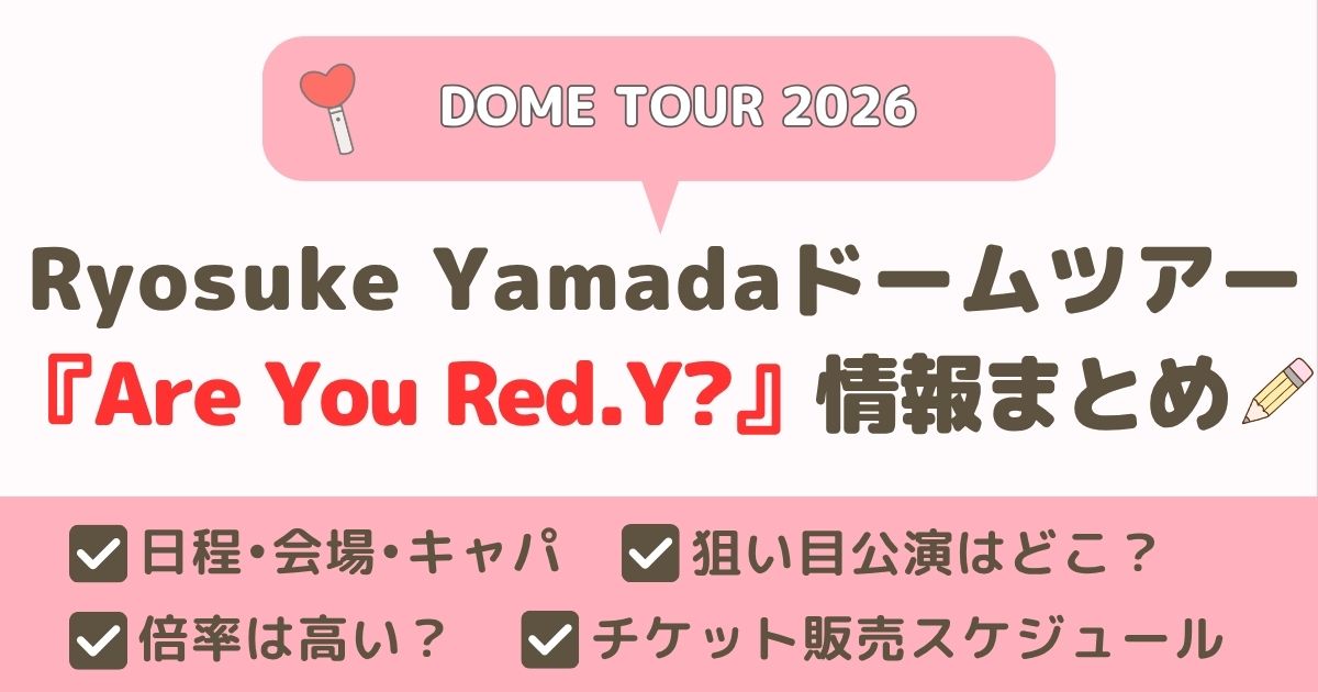 生粋のジャニオタの筆者が、山田涼介のソロドームツアーについて、全力で楽しむための情報をまとめました。チケット入手のコツから当日までにやっておきたい準備まで初参戦の方にもわかりやすく解説しています。