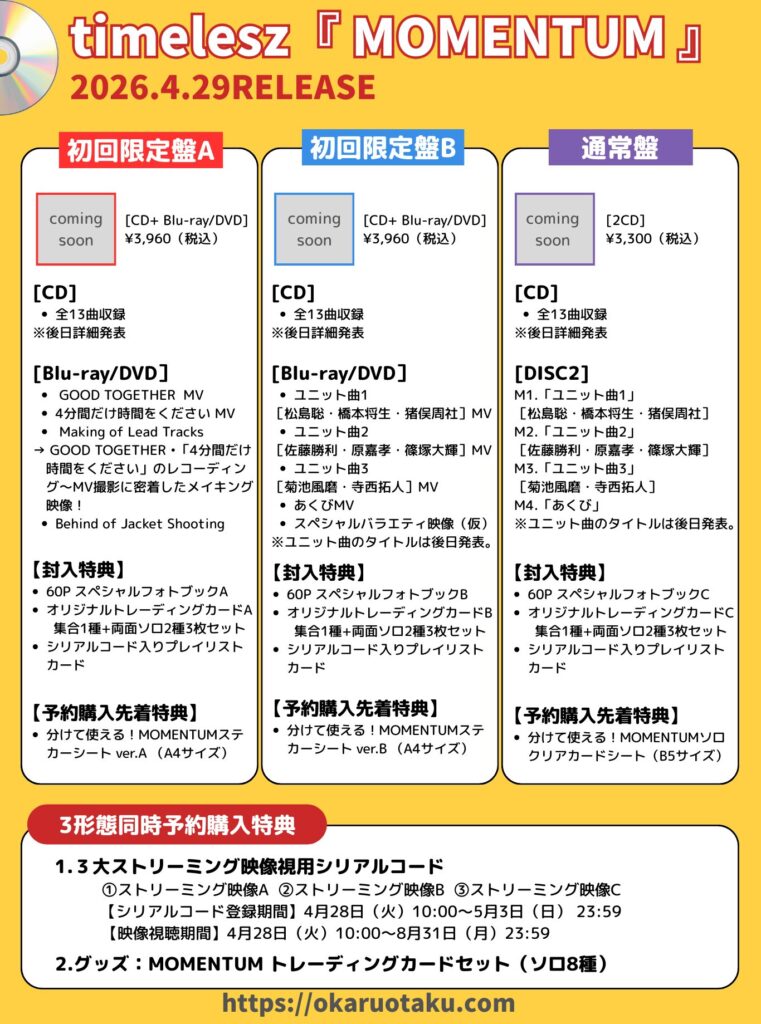 timelesz(タイムレス)のニューアルバム『 MOMENTUM 』が4月29日(水)に発売決定!