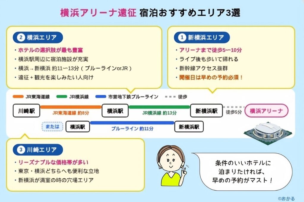 横浜アリーナのライブに参戦するとき、「どのエリアに泊まればいいんだろう?」と迷いますよね。